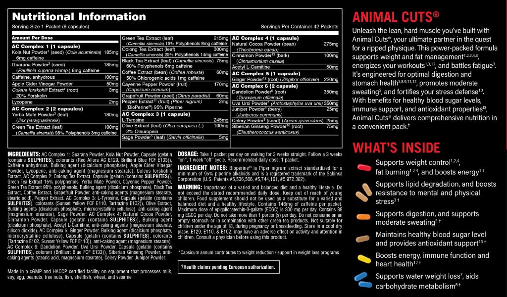 Το θέμα είναι ότι οι αθλητές προσπαθούν να ξεπεράσουν πολλά και διαφορετικά εμπόδια προκειμένου να αποκτήσουν ένα σκληρό και γραμμωμένο σώμα. Το Animal Cuts είναι από τις ελάχιστες φόρμουλες που μπορούν να εγγυηθούν πραγματικά αποτελέσματα, χτυπώντας το λίπος από όλες τις πιθανές πλευρές του.