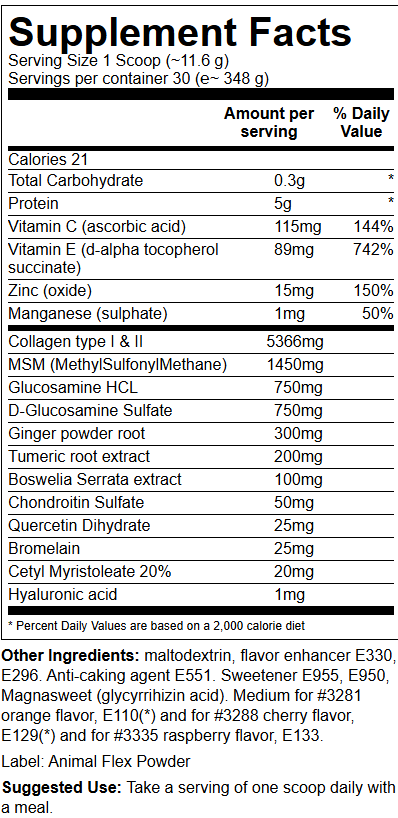 Το Σύμπλεγμα Λίπανσης και Υποστήριξης Αρθρώσεων έχει σχεδιαστεί με κολλαγόνο, υαλουρονικό οξύ (HA) και κατοχυρωμένο με δίπλωμα ευρεσιτεχνίας κετυλομυριστολεϊκό (CMO). Για να βοηθήσει στην προώθηση της αποκατάστασης και στη μείωση του πόνου, η σκόνη Animal Flex χρησιμοποιεί ισχυρά φυσικά φυτικά εκχυλίσματα για να βοηθήσει στην αντιμετώπιση του φορτίου των ελεύθερων ριζών – συνέπεια της φλεγμονής των αρθρώσεων. Βότανα και εκχυλίσματα όπως ο κουρκουμάς, η μποσουέλια και η ρίζα τζίντζερ έχουν αποδειχθεί ότι βοηθούν στην αναστολή των προφλεγμονωδών μεταβολιτών, γεγονός που οδηγεί σε ισχυρή και παρατεταμένη αντιφλεγμονώδη δράση, η οποία είναι κρίσιμη για τη διατήρηση των αρθρώσεων χωρίς πόνο.(**)