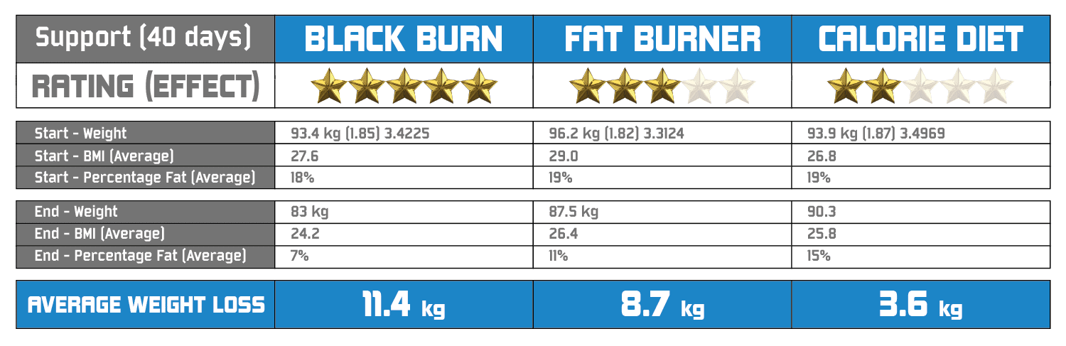 Πριν από την κυκλοφορία του Black Burn στην αγορά, πραγματοποιήθηκαν τρεις μελέτες για να δοκιμαστεί η επίδραση της φόρμουλας υπό πρακτικές συνθήκες. Οι δύο πρώτες μελέτες χρησιμοποιήθηκαν για την εφαρμογή μιας βήμα προς βήμα βελτιστοποίησης του τύπου. Η τρίτη μελέτη είναι τελικά το θέμα: τα αποτελέσματα όταν ανεβείτε στην ζυγαριά! Ποιοι συμμετείχαν σε αυτή τη μελέτη; Δεκαπέντε άντρες, όλοι τους φανατικοί προπονητές δύναμης, ηλικίας 19 (ο μικρότερος) έως 42 (ο μεγαλύτερος). Όλοι οι συμμετέχοντες βγήκαν από μια περίοδο διογκώσεως και ήθελαν να στεγνώσουν και να κάψουν λίπος για την αρχή της σεζόν ακριβώς μπροστά. Πέντε συμμετέχοντες (η πρώτη ομάδα) χρησιμοποίησαν το Black Burn για 40 ημέρες λαμβάνοντας δύο κάψουλες τρεις φορές την ημέρα. Αυτό συνδυάστηκε με μια κανονική διατροφή και ένα πρόγραμμα προπόνησης που χρησιμοποιείται για bodybuilders. Το μόνο συμπλήρωμα που επιτρέπεται ήταν το μέγιστο 100 γραμμάρια πρωτεΐνης (χρησιμοποιώντας 100% σέικ ορού γάλακτος). Η δεύτερη ομάδα είχε το ίδιο πρόγραμμα διατροφής και προπόνησης, αλλά πήρε διαφορετική μάρκα λιποδιαλύτη. Η τρίτη ομάδα δεν χρησιμοποίησε καθόλου λιποδιαλύτη. Η μελέτη παρακολουθήθηκε από μια ομάδα δύο γιατρών, ενός διαιτολόγου και ενός personal trainer.