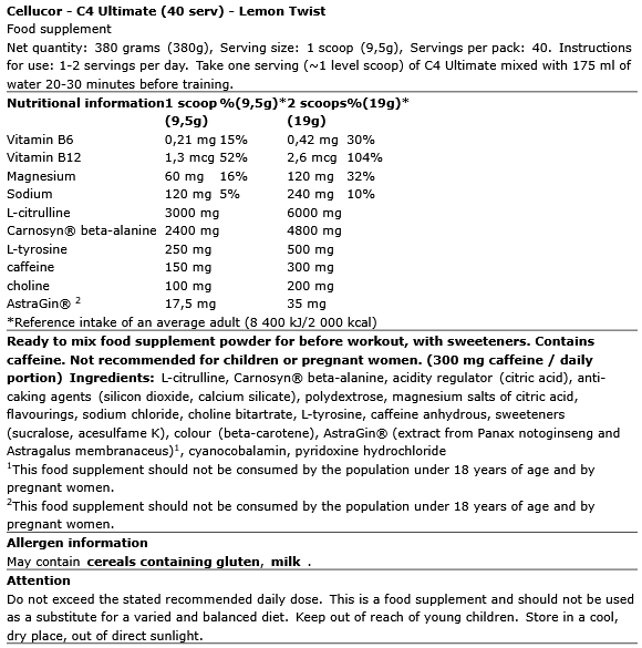 Για πάνω από μια δεκαετία, η οικογένεια C4 ηγείται της κατηγορίας των pre-workout και το Ultimate είναι η πιο δυνατή εκδοχή του μέχρι σήμερα. Το C4 Ultimate είναι ένα υψηλό διεγερτικό pre-workout που έχει σχεδιαστεί για να προσφέρει διαρκή ενέργεια, πρηξίματα και μυϊκή αντοχή. Το C4 Ultimate προσφέρει ενέργεια που μπορείτε να νιώσετε, εξαιρετική εστίαση και κορυφαία απόδοση. Το μόνο που χρειάζεται είναι μια μεζούρα και μπορείτε να νιώσετε τη διαφορά.