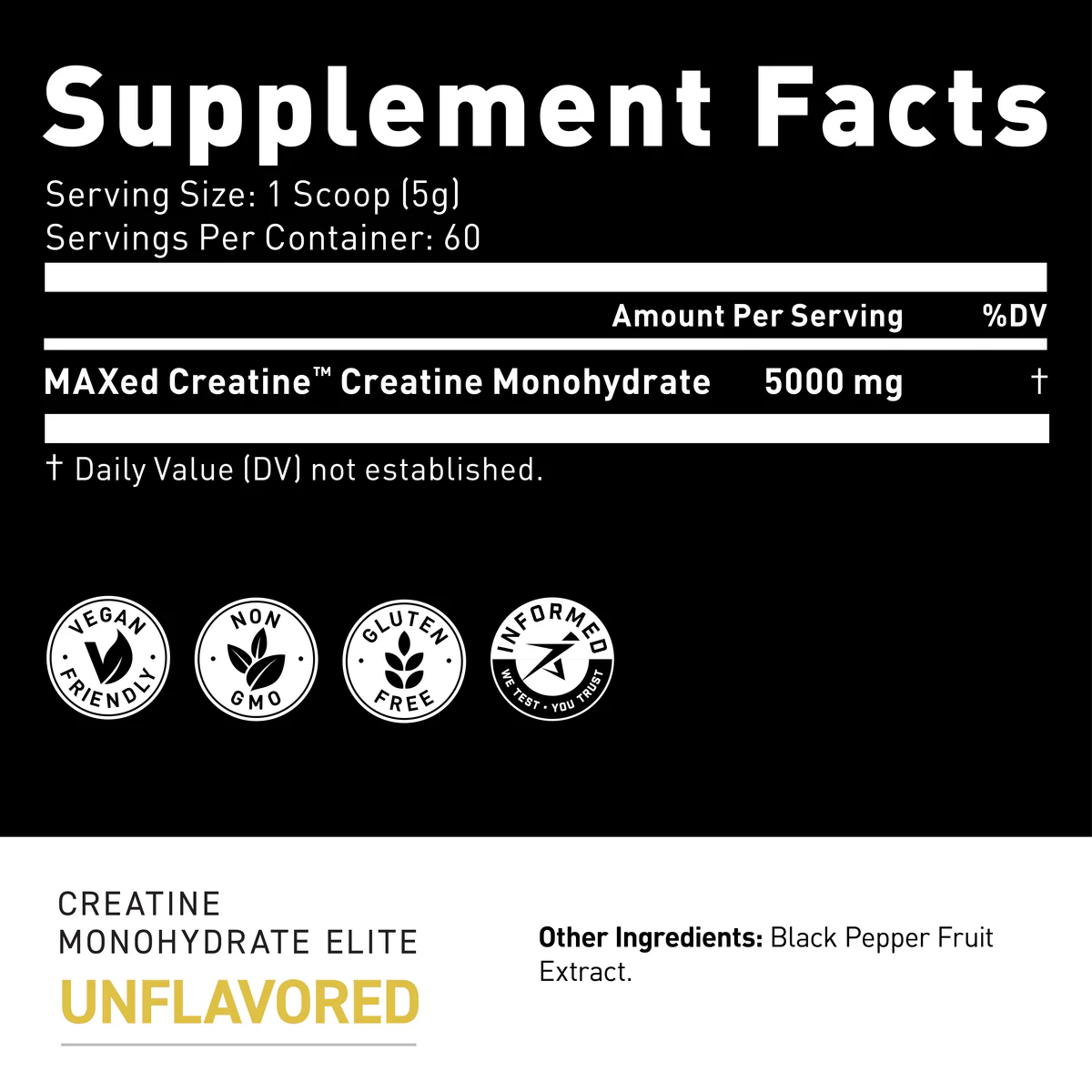 Η μονοϋδρική κρεατίνη είναι ένα από τα πιο καλά ερευνημένα συμπληρώματα που υπάρχουν, το οποίο έχει αποδειχθεί ότι βοηθά στην ανάπτυξη μυών, στην αύξηση της δύναμης και στη βελτίωση της απόδοσης.* Το Creatine Monohydrate Elite αναβαθμίζει τη δύναμη της κρεατίνης, χάρη στην προσθήκη εκχυλίσματος φρούτων MAXCatalyst™ Piper nigrum. Αυτό το συστατικό από μαύρο πιπέρι έχει αποδειχθεί ότι αυξάνει την απορρόφηση της κρεατίνης. Αυτή είναι η επόμενη εξέλιξη της κρεατίνης για μέγιστη δύναμη, ισχύ και μέγιστη άπαχη μάζα.*