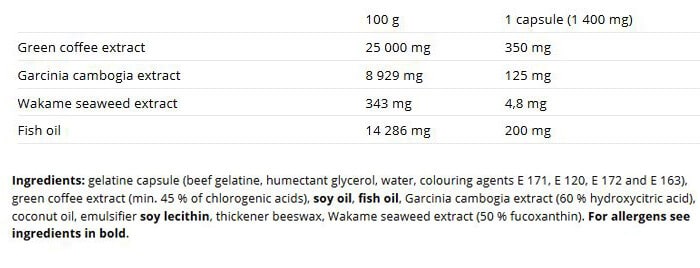 Περιέχει τις αυστηρά ελεγμένες δόσεις φυκιών, εκχυλίσματος πράσινου καφέ και γκαρσίνια καμπότζια. Δεν περιέχει καθόλου διεγερτικές ουσίες γι αυτό και είναι ιδανικό για λήψη ακριβώς πριν τον ύπνο.