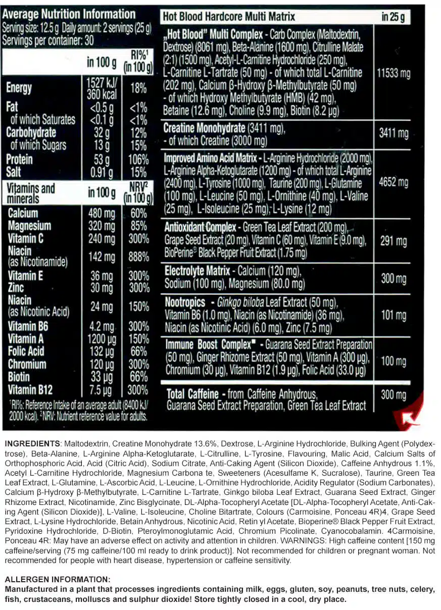Το ανανεωμένο σύμπλεγμα ενεργών συστατικών του HOT BLOOD HARDCORE υποστηρίζει το σώμα σας κατά τη διάρκεια σωματικής άσκησης και προπόνησης υψηλής έντασης, καθώς τα 3g κρεατίνης στο προϊόν είναι επιστημονικά αποδεδειγμένο ότι αυξάνουν την απόδοση κατά τη διάρκεια διαδοχικών, μικρής διάρκειας, υψηλής έντασης προσπαθειών όπως προπόνηση με βάρη ή διαλειμματική άσκηση!* Η βιταμίνη Β6 και η νιασίνη συμβάλλουν στη φυσιολογική λειτουργία του νευρικού συστήματος. Το χρώμιο εμπλέκεται στον φυσιολογικό μεταβολισμό των μακροθρεπτικών συστατικών. Η βιοτίνη εμπλέκεται σε φυσιολογικές μεταβολικές διεργασίες που παράγουν ενέργεια. Η βιταμίνη C συμβάλλει στην προστασία των κυττάρων από το οξειδωτικό στρες. Το φυλλικό οξύ, η βιταμίνη Β12 και η βιταμίνη Α συμβάλλουν στη φυσιολογική λειτουργία του ανοσοποιητικού συστήματος.