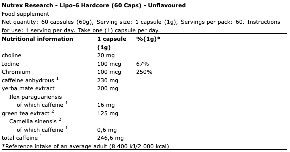 Το LIPO-6 HARDCORE προορίζεται γενικά για υγιείς ενήλικες. Δεν συνιστάται για ανήλικους, έγκυες ή θηλάζουσες γυναίκες ή άτομα με ορισμένες ιατρικές παθήσεις. Συνιστάται η συμβουλή ενός επαγγελματία υγείας πριν από τη χρήση.