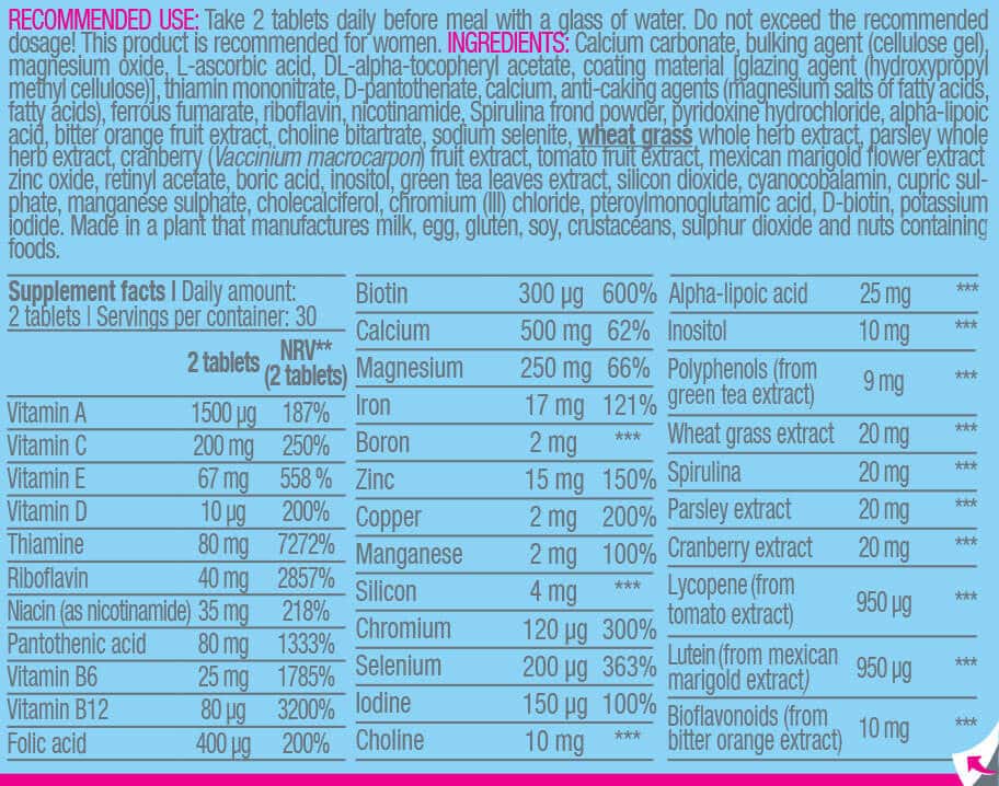 Η BioTech USA Women’s Performance παρέχει ισορροπημένη διατροφή με έμφαση στα αντιοξειδωτικά, τις βιταμίνες και τα μέταλλα για να συμπληρώσει μια υγιεινή διατροφή ειδικά σχεδιασμένη για τις γυναίκες.