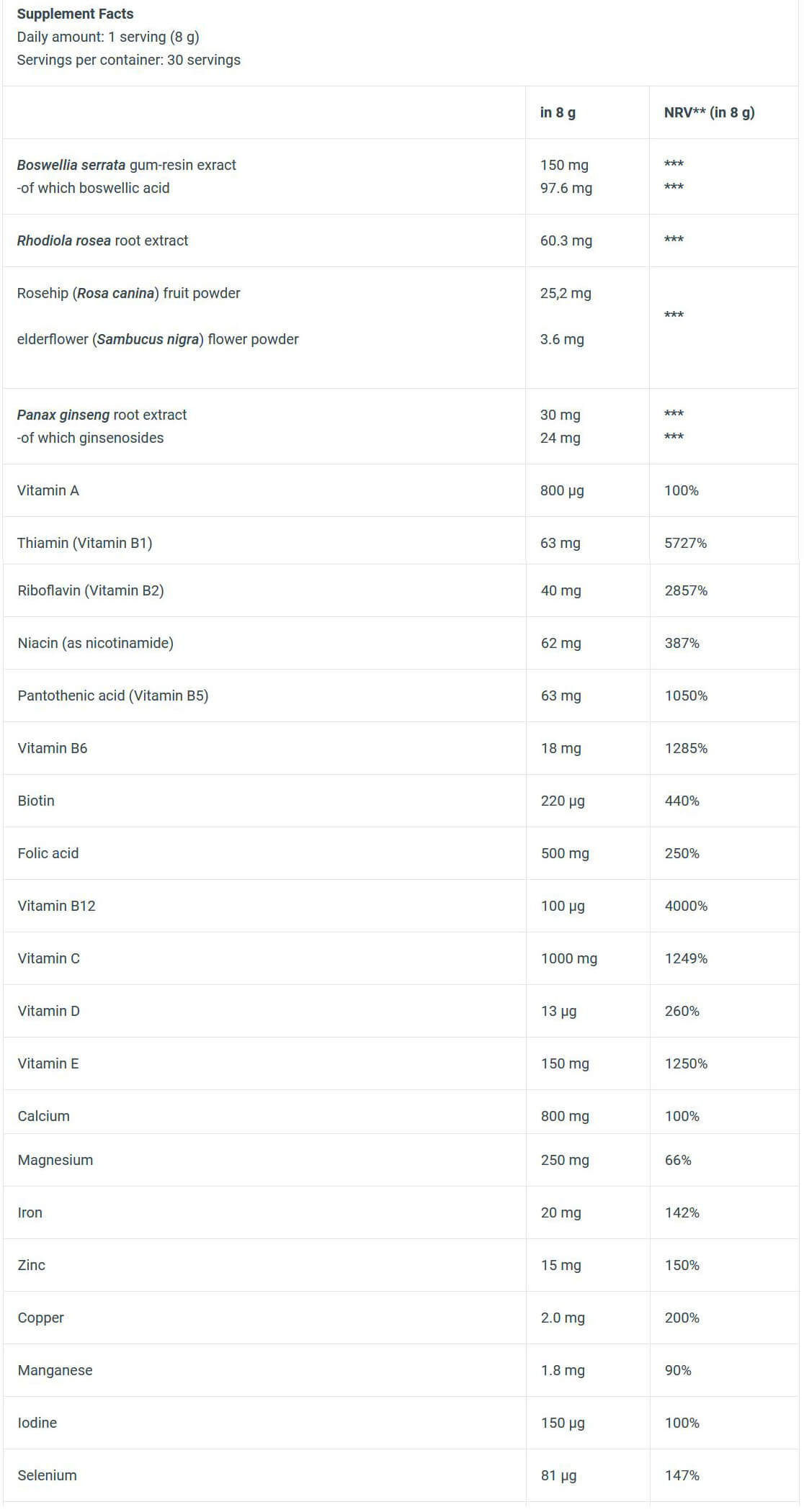 Το προϊόν περιέχει νιασίνη (βιταμίνη Β3), ριβοφλαβίνη (βιταμίνη Β2), βιταμίνη Β6, θειαμίνη (βιταμίνη Β1), βιοτίνη (βιταμίνη Β7), παντοθενικό οξύ, βιταμίνη C, σίδηρο, ασβέστιο, μαγνήσιο, μαγγάνιο, ιώδιο και χαλκό που συμβάλλουν στην φυσιολογικό μεταβολισμό που παράγει ενέργεια. Επιπλέον, η βιταμίνη C, η νιασίνη, η ριβοφλαβίνη, η βιταμίνη Β6, η βιταμίνη Β12, το φολικό οξύ, το παντοθενικό οξύ, ο σίδηρος και το μαγνήσιο συμβάλλουν επίσης στη μείωση της κούρασης και της κόπωσης.