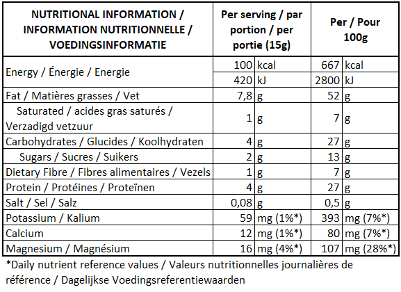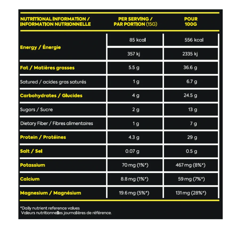 Almond and chocolate spread with vegetable proteins and fats. Ingredients: Roasted sunflower seeds, Pea protein (16%), Cane sugar, Canola oil (8%), Dry roasted almonds (4%), Cocoa powder (4%), Medium chain triglycerides (MCT) coconut oil (2%), Flax seeds, Himalayan pink salt.