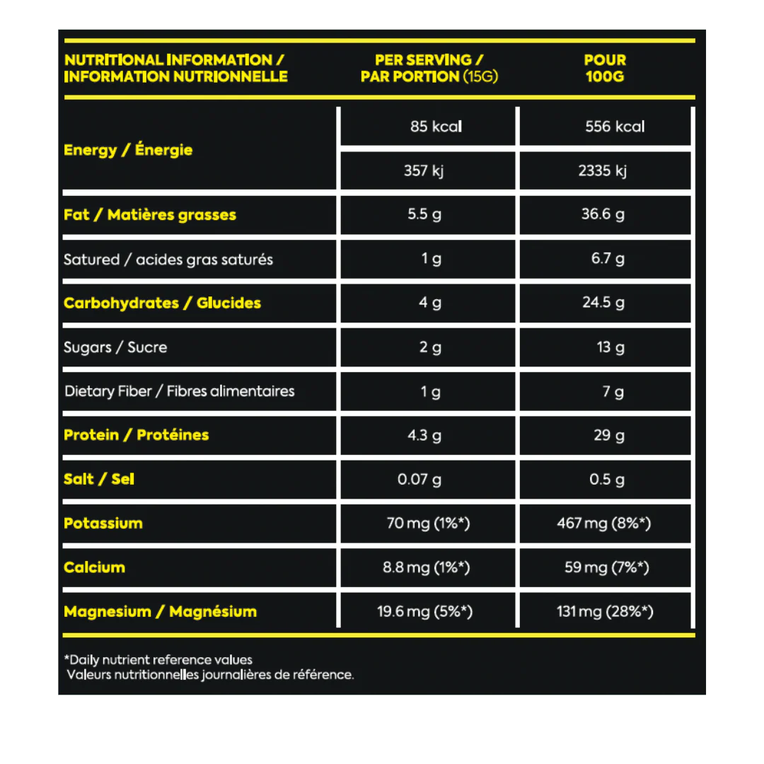 Almond and chocolate spread with vegetable proteins and fats. Ingredients: Roasted sunflower seeds, Pea protein (16%), Cane sugar, Canola oil (8%), Dry roasted almonds (4%), Cocoa powder (4%), Medium chain triglycerides (MCT) coconut oil (2%), Flax seeds, Himalayan pink salt.