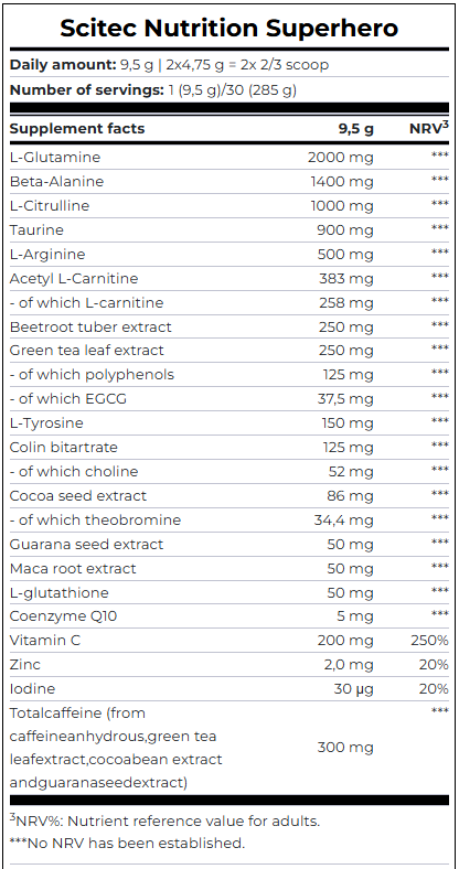 Αν είστε εξοικειωμένοι με τις προηγούμενες προπονήσεις μας για τους υπερήρωες, θα ξέρετε τι να περιμένετε αν δεν το έχετε δοκιμάσει πριν, τώρα είναι η κατάλληλη στιγμή! Αμινοξέα, φυτικά εκχυλίσματα, χολίνη, συνένζυμο Q10, καφεΐνη, βιταμίνη C και μέταλλα. Δεν είναι απλώς ένα προ-προπονητικό! Χάρη στα συστατικά, μπορεί επίσης να χρησιμοποιηθεί ως μέσο διατήρησης της πνευματικής συγκέντρωσης, καθώς ο ψευδάργυρος και το ιώδιο βοηθούν στη διατήρηση της φυσιολογικής νοητικής λειτουργίας!