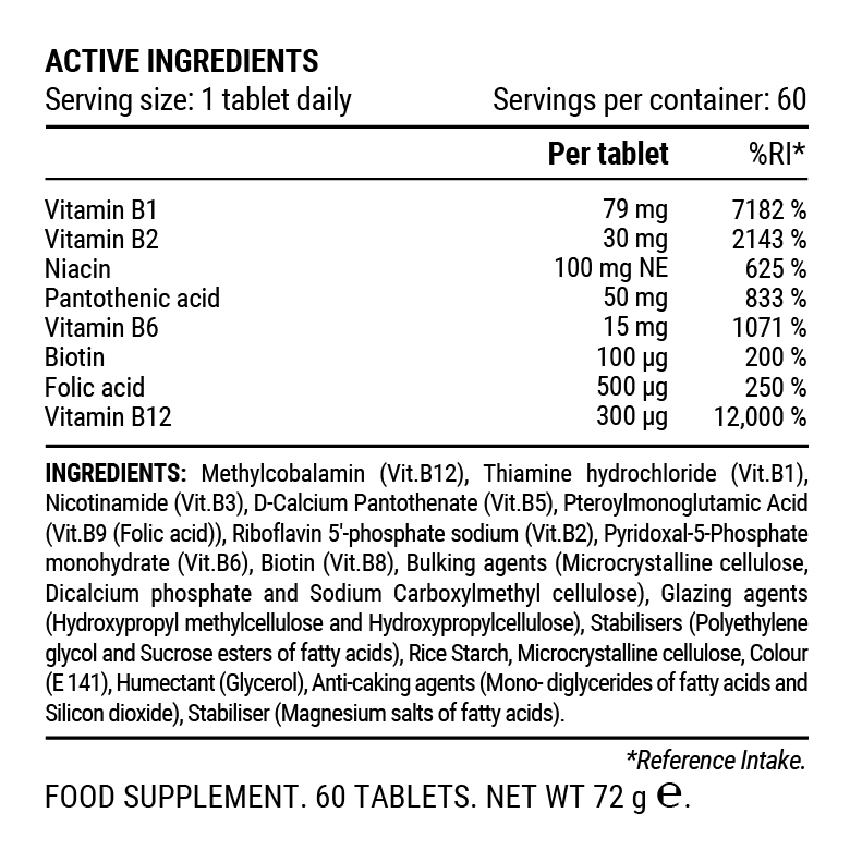 Αυτή η σύνθεση υποστηρίζει επίσης τη λειτουργία του γνωστικού και του νευρικού συστήματος χρησιμοποιώντας εξαιρετικά ενεργοποιημένες μορφές βιταμίνης Β που λειτουργούν στον μεταβολισμό υδατανθράκων, πρωτεϊνών και λιπών.