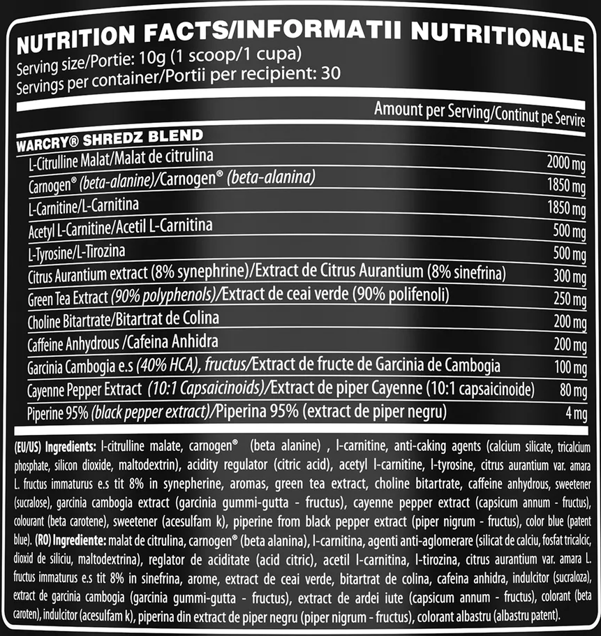 WARCRY® SHREDZ – Ένα καινοτόμο συμπλήρωμα που έχει σχεδιαστεί σχολαστικά για να υποστηρίζει την καύση λίπους και τον σχηματισμό των μυών. Αυτή η ισχυρή φόρμουλα είναι αποτέλεσμα εκτεταμένης έρευνας, σχεδιασμένη να επιταχύνει τον μεταβολισμό, να ενισχύει την ενέργεια και να υποστηρίζει την καύση λίπους. Κάθε συστατικό επιλέγεται για τη δυνατότητά του να συμβάλλει σε κορυφαίες επιδόσεις, είτε στοχεύετε στην τόνωση είτε στην αύξηση της αντοχής σας στα όριά της. Το WARCRY SHREDZ διατίθεται σε μορφή σκόνης, ιδανικό για εύκολη χρήση ως λιποδιαλύτης πριν από την προπόνηση.