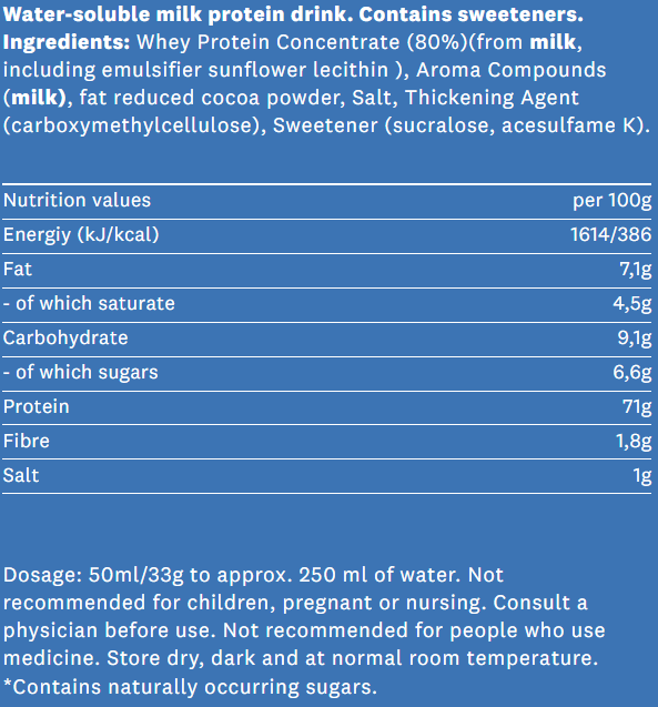 Υψηλής ποιότητας πρωτεΐνη ορού γάλακτος σε σκόνη (80% πρωτεΐνη WHEY) σε 2 γεύσεις. Συμβάλλει στην ανάπτυξη και διατήρηση της μυϊκής μάζας και υποστηρίζει την μυϊκή αποκατάσταση μετά την προπόνηση. Αποτελεί ιδανική επιλογή χωρίς ζάχαρη & χωρίς φοινικέλαιο. Περιέχει γλυκαντικά.